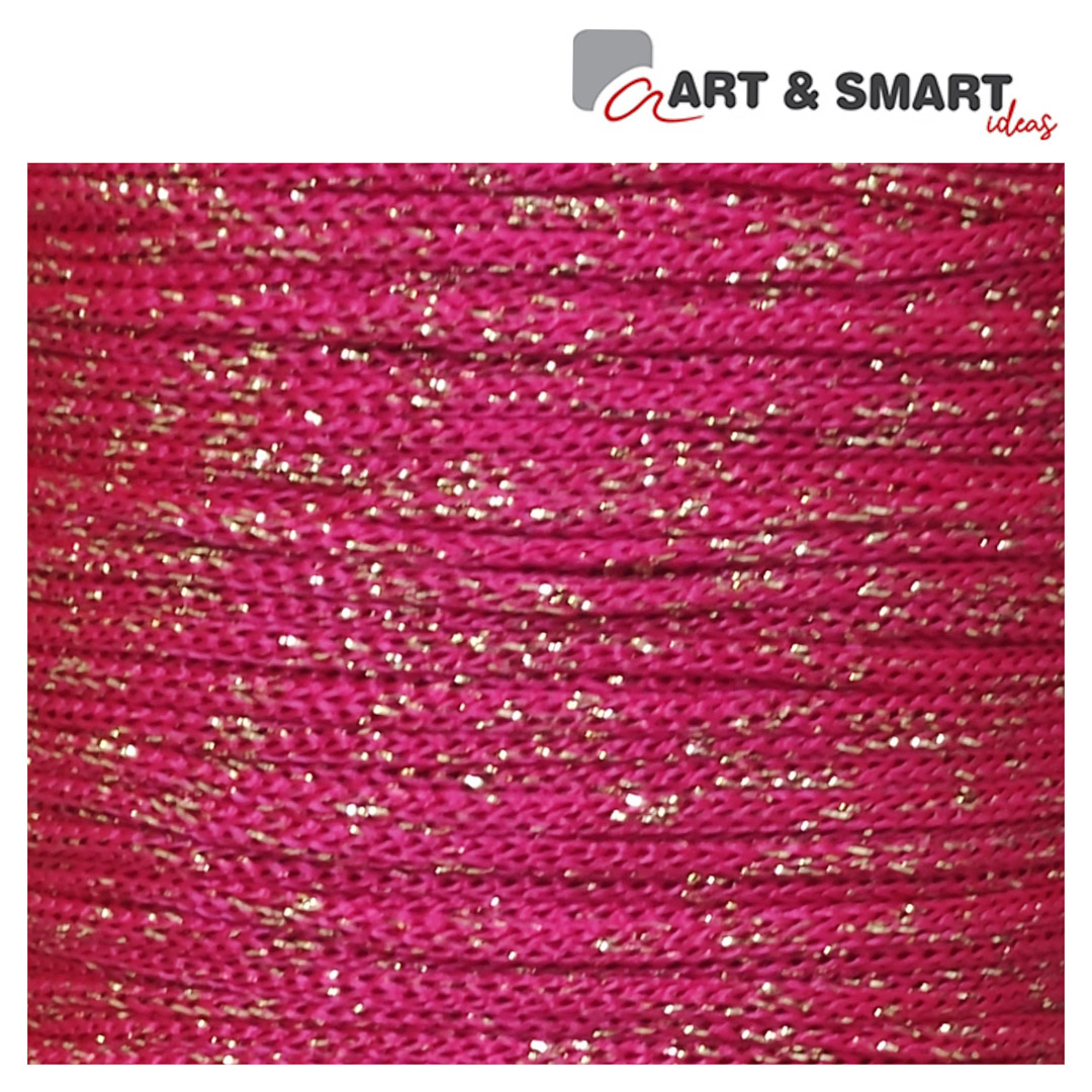 Νήμα 100% από πολυπροπυλένιο κόκκινο σκούρο No5 και μεταλλόνημα χρυσό, 3mm. Διάμετρος μπομπίνας 11,4cm. Ύψος 12,2cm. Βάρος 390gr. Μήκος 150m.