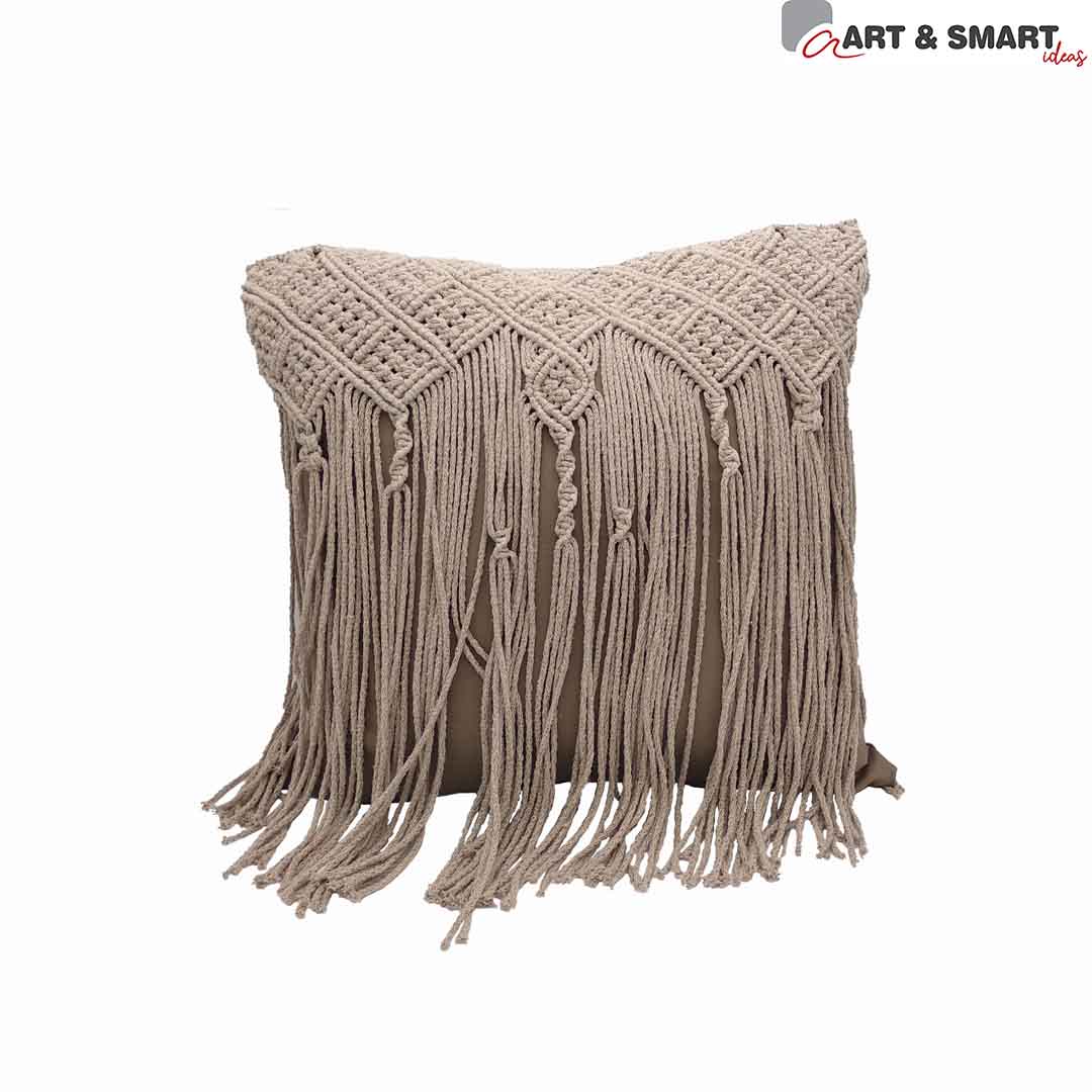 Διακοσμητικά μαξιλάρια μακραμέ χειροποίητα ,ελληνικά. Με υφασμάτινη θήκη με φερμουάρ για να μπορούν να αλλαχθούν. Το μακραμέ είναι ραμμένο επάνω στη θήκη. Καφέ μαξιλάρι 45 Χ 45cm με διακόσμηση μακραμέ σε βαμβακερό νήμα μπεζ.