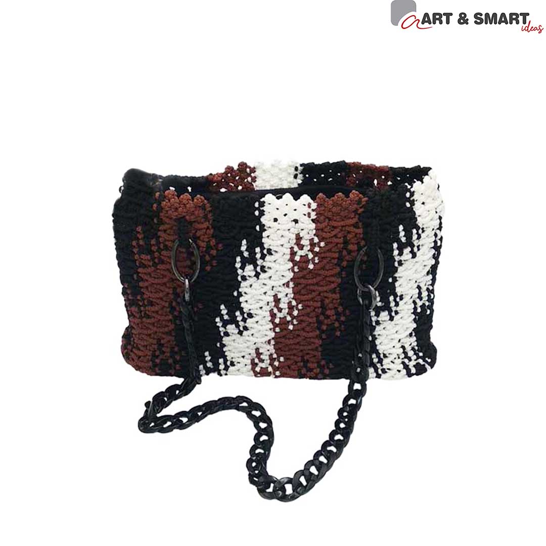 Τσάντα μακραμέ χειροποίητη τρίχρωμη άσπρο, καφέ ανοιχτό, μαύρο.  Με χερούλια από πρωτότυπη κοκάλινη αλυσίδα.