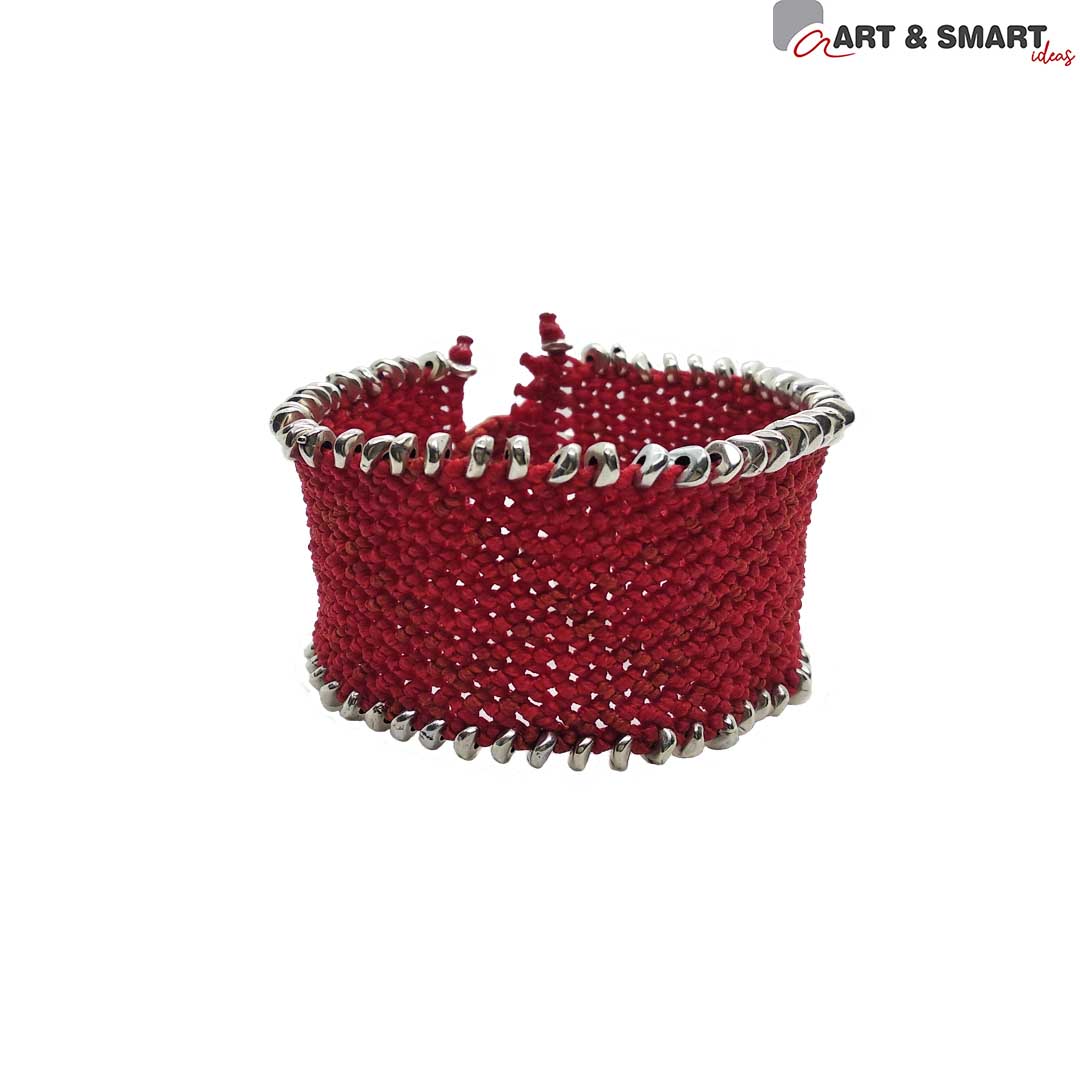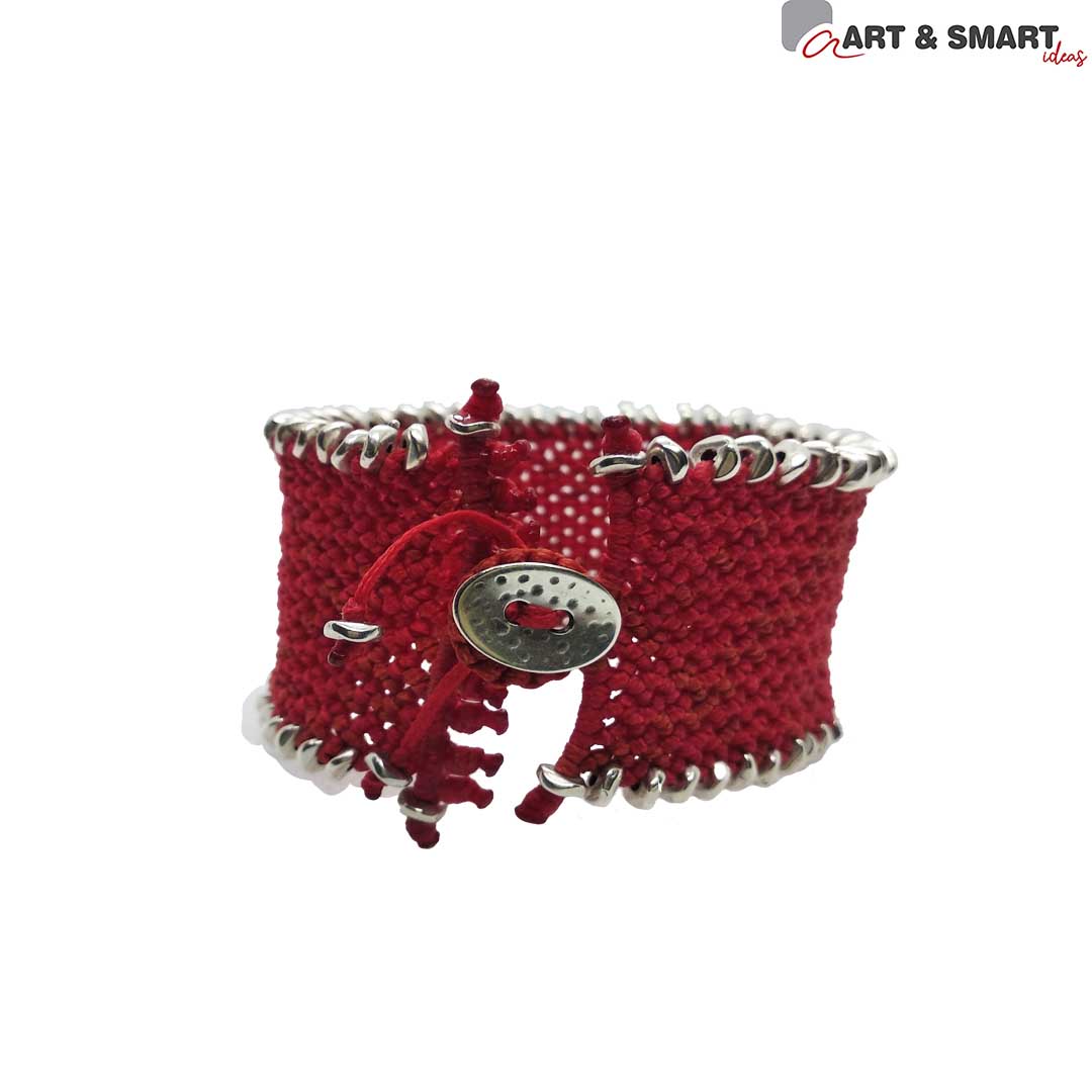 Βραχιόλι μακραμέ χειροποίητο φαρδύ σε χρώμα πορτοκαλί ηλιοκαμένο με ασημί μεταλλικά στοιχεία στο επάνω και κάτω μέρος και με μεταλλικό οβάλ κούμπωμα σε ασημί χρώμα στο κλείσιμο.